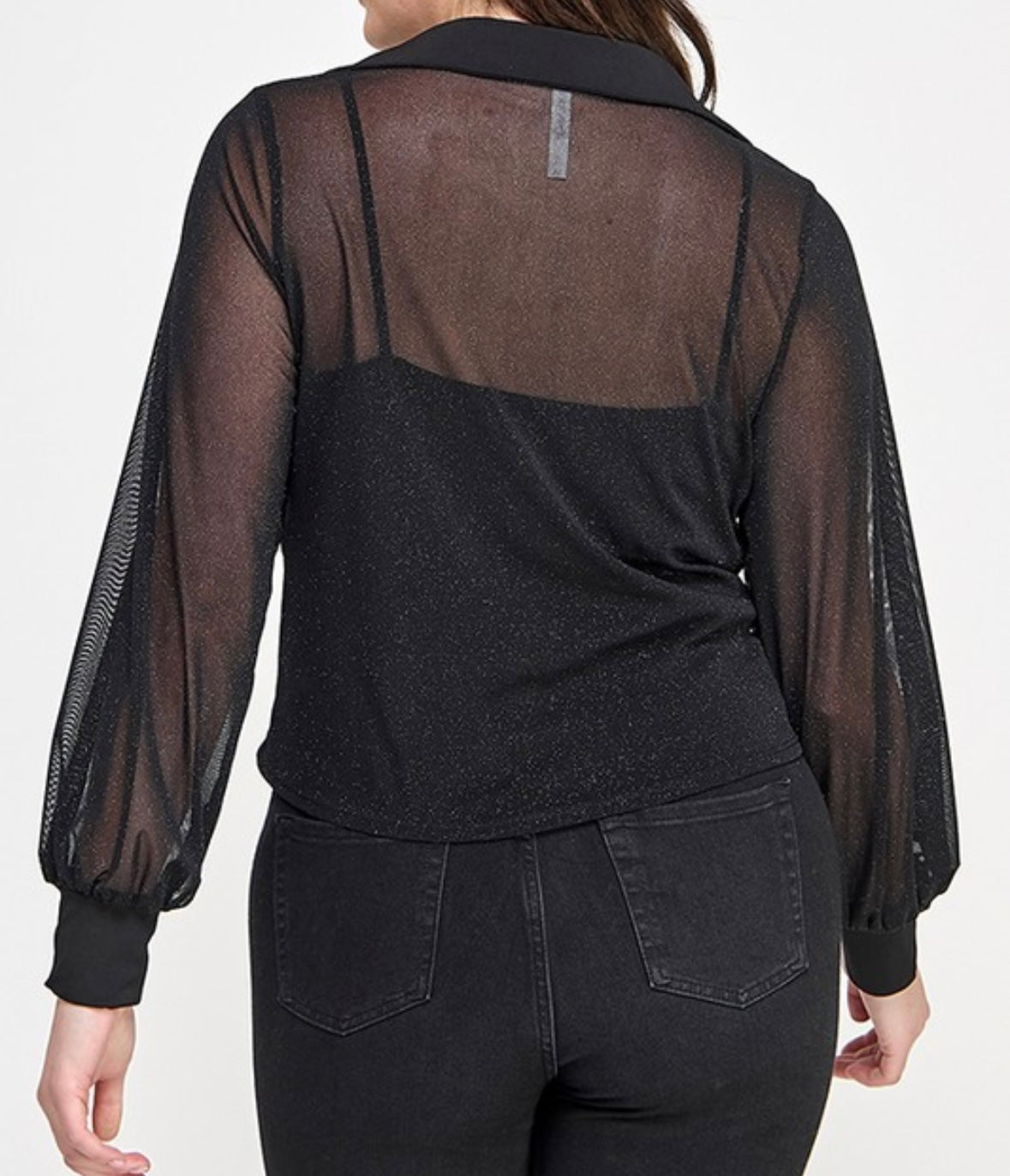 Plus size long sleeve glitter mesh front tie top with collar