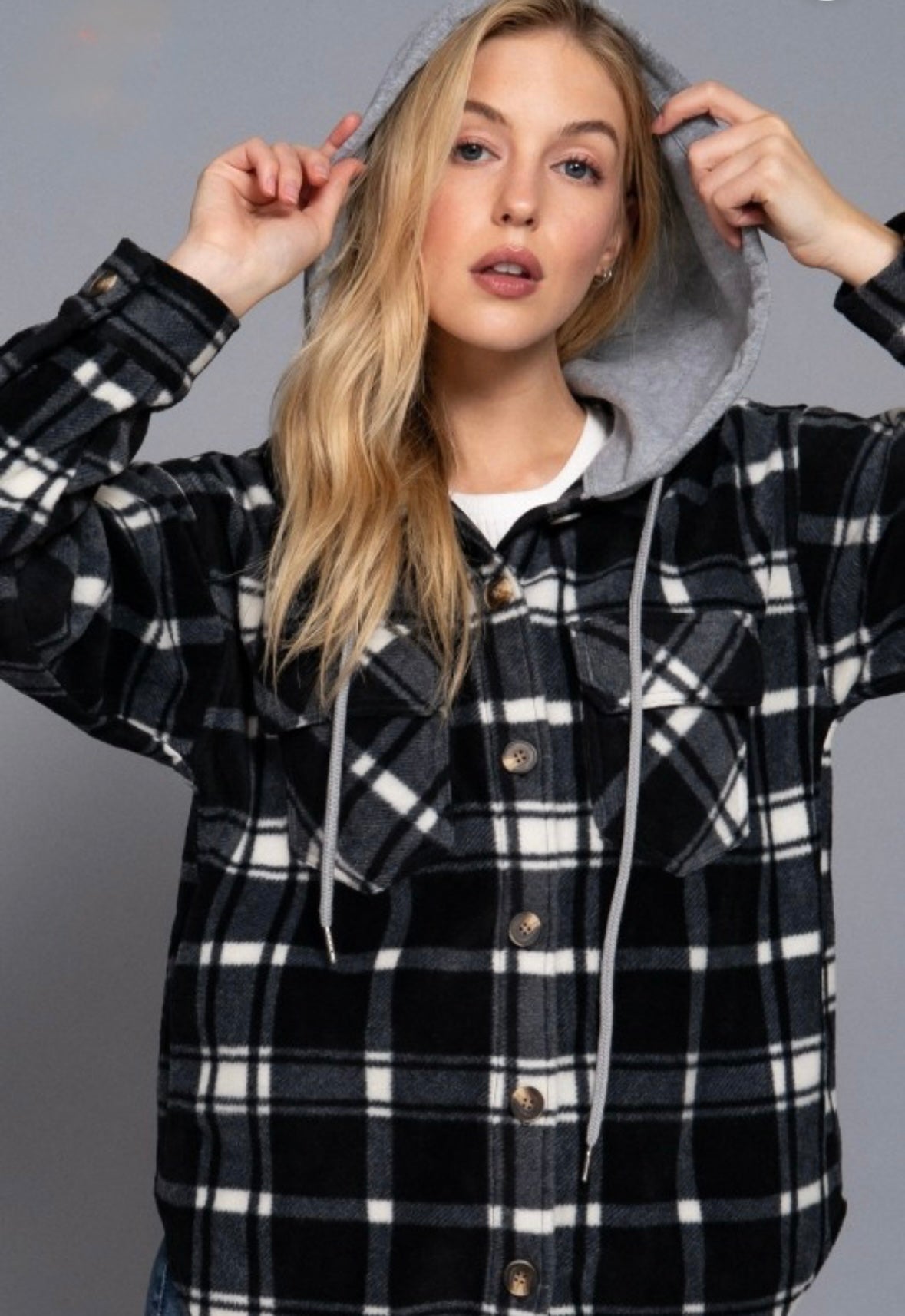 Plus size long sleeve plaid print button down with hoodie casual fleece jacket