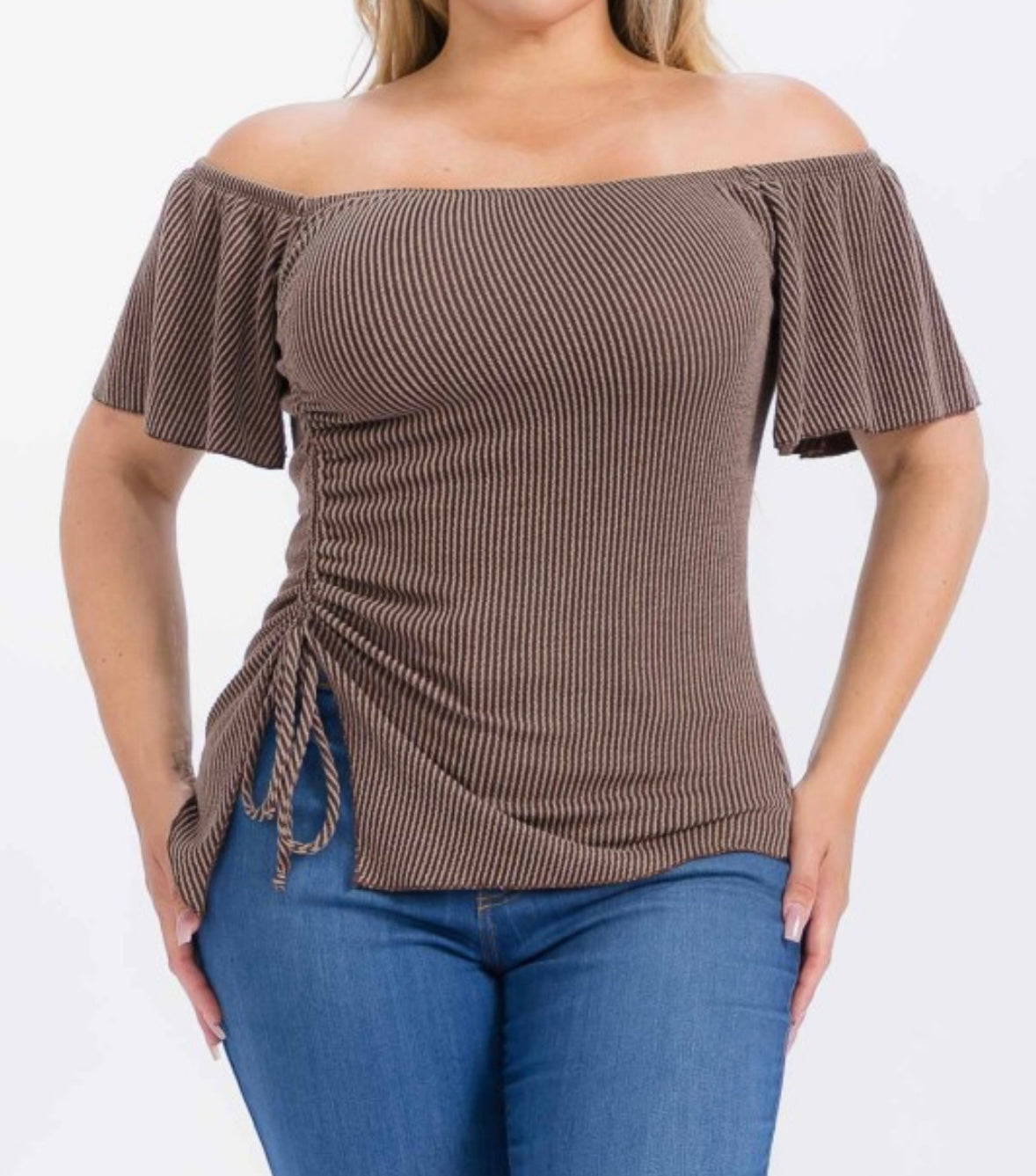 Plus size urban rib off shoulder short sleeve,  drawstring ruched top